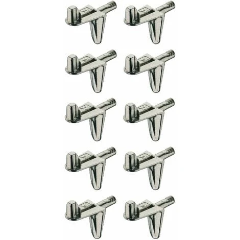 10x Taquet équerre à encastrer ; Matière = Alliage zingué ; A encastrer à l’aide de ses deux encoches dans diamètre de perçage de 3mm ; Pour fonds en bois ; Longueur de goujon = 7,3mm ; Capacité de charge par pièce = 6,25kg (indication de la capacité de charge par pièce, à savoir 25kg de capacité de charge en cas d’utilisation de 4 taquets, testé avec plaque de choc 1,7 kg selon DIN EN 16337:2013-08)