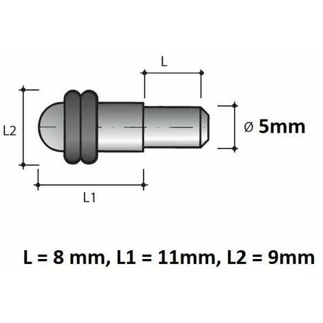 10x Taquet avec amortisseur revêtement plastique ; Spécialement conçu pour les tablettes en verre / vitre ou encore en bois ; Diamètre Ø = 5mm ; Longueur à enfoncer L = 8mm ; Longueur L1 = 11mm ; Diamètre total avec revêtement L2 = 9mm