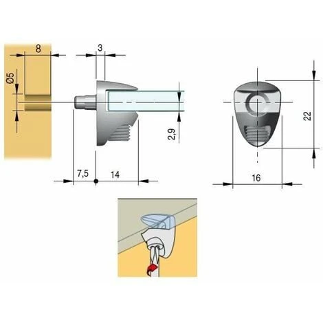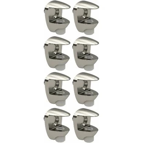 8x Taquet pour tablette en verre / vitre ; Alliage de zinc et plastique ; Finition nickelée ; Tablette fixée en tournant la vis de réglage ; Epaisseur de la tablette = 5 – 6mm