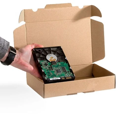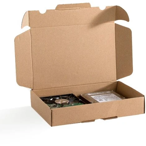 Boîte carton avec couvercle charnière et languette d’ouverture.