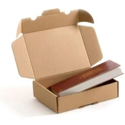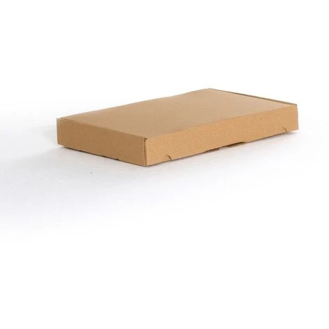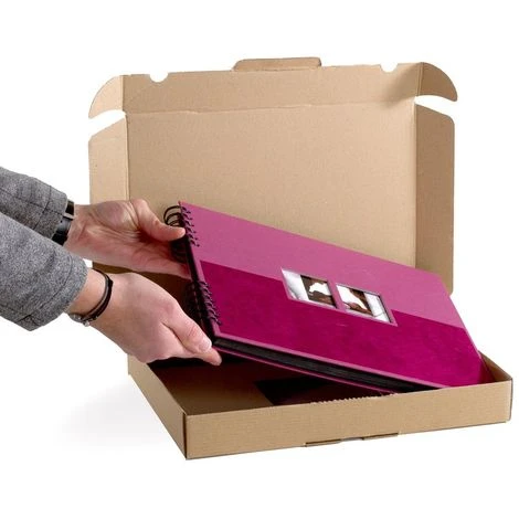 Boîte carton avec couvercle charnière et languette d’ouverture.