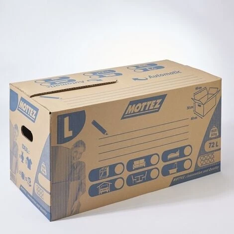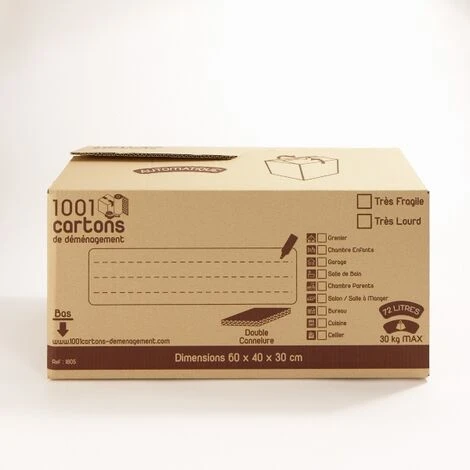 Carton déménagement renforce double cannelure – épaisseur et rigidité supérieures à un carton standard simple cannelure. Il est ideal pour vos objets lourds et / ou fragiles. Il résiste bien mieux à l’écrasement. Ideal pour le stockage longue durée. Fermeture automatique sans adhésif du rabat du dessus pour gagner du temps. 2 poignées de transport double renfort ergonomique. Zone de marquage du contenu et de la pièce pour connaitre l’endroit où ranger le carton double cannelure. Dimension : 60 x 40 x 30 cm Double cannelure 3 + 4 mm = 7 mm Charge utile : 20 kg