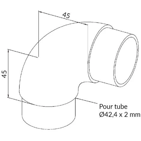 Le raccord 90° coude pour tube permet de relier deux tubes de main-courante qui sont en angle droit. Cette pièce de qualité en inox 304 assure la solidité et la stabilité de votre garde-corps design. Son avantage : elle est adaptée pour un garde-corps d’intérieur mais aussi dans votre jardin. Grâce à sa résistance aux agressions extérieures, elle a une longue durée de vie. Pour vos mains courantes de garde-corps, osez l’originalité de ce coude de raccord 90° ! Grâce à cette pièce entièrement faite d’acier inoxydable 304, vos mains courantes tubulaires de diamètre 42,4x2mm s’offrent un style innovant. Même le design de la pièce est pensé pour une installation facile, à la portée de tout adulte consciencieux. Il s’agit en effet d’insérer chaque bout dans un tube inox, pour obtenir un accolement solide et << à l’équerre >>. Il suffira d’encoller le raccord coudé finition avec une colle spéciale inox à prise rapide. Ainsi, vous profiterez de la même stabilité qu’avec un coude d’angle classique, mais avec une belle courbe qui panache. Le tout sublimé par un fini brossé-satiné mat, typique des habitats contemporains ! Avec un diamètre de 42,4 mm pour 2 mm d’épaisseur, ce raccord coudé se destine à la jonction à 90° des tubes inox Ø 42,4 mm. Son matériau résistant à la corrosion et aux chocs permet une utilisation sûre et durable à l’extérieur, hors milieux marins et bords de piscines.