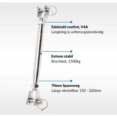 Acier inoxydable : le tendeur métallique est fabriqué en acier inoxydable V4A poli pour une résistance aux intempéries et à l’abrasion. Par conséquent, ils conviennent parfaitement à une utilisation à long terme.