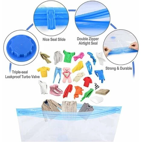 Facile à utiliser avec tout type d’aspirateur et comportent une turbo valve de lib��ration d’air pour un déballage rapide. Idéal pour ranger vos vêtement ,couettes, couvertures, serviettes dans vos armoire.