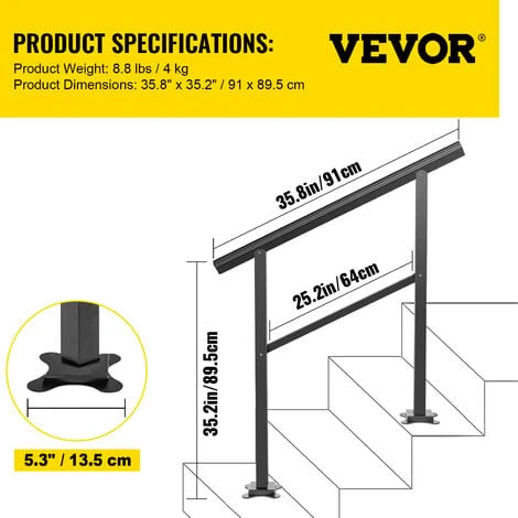 Réglable pour 2-3 Marches : Taille du produit (L x H) : 91 x 89,5 cm ; distance entre les barres verticales : 64 cm. Grâce à son angle réglable de 0 à 30°, notre main courante pour escalier extérieur s’adapte à vos 2 ou 3 marches. Elle est parfaite pour aider les gens à garder l’équilibre lorsqu’ils montent et descendent les escaliers sous la pluie ou en hiver.